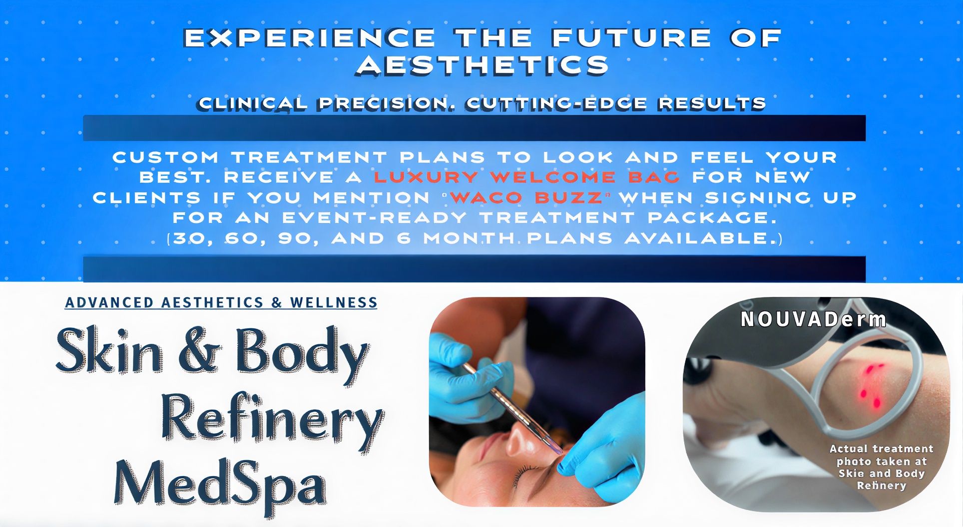 Dr. Smith and his team build custom treatment plans around how you want to look and feel. They're running 30, 60, 90, and 6-month event-ready packages, and new clients who mention Waco Buzz when signing up get a luxury welcome bag as a thank-you.
